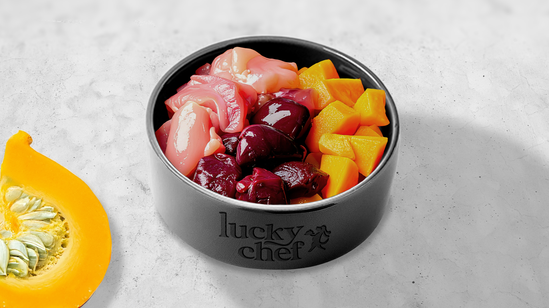 Das Kerngehäuse und die Samen aus dem Hokkaido-Kürbis entfernen. Hokkaido-Kürbis und Hühnerbrust in kleine Würfel schneiden