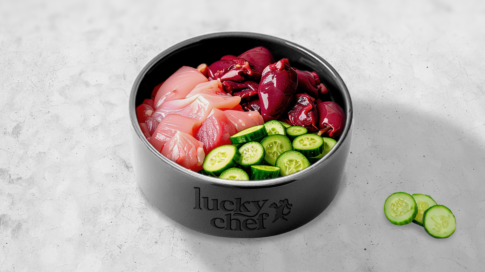 Die Putenbrust und Hühnerherzen in kleine Würfel schneiden