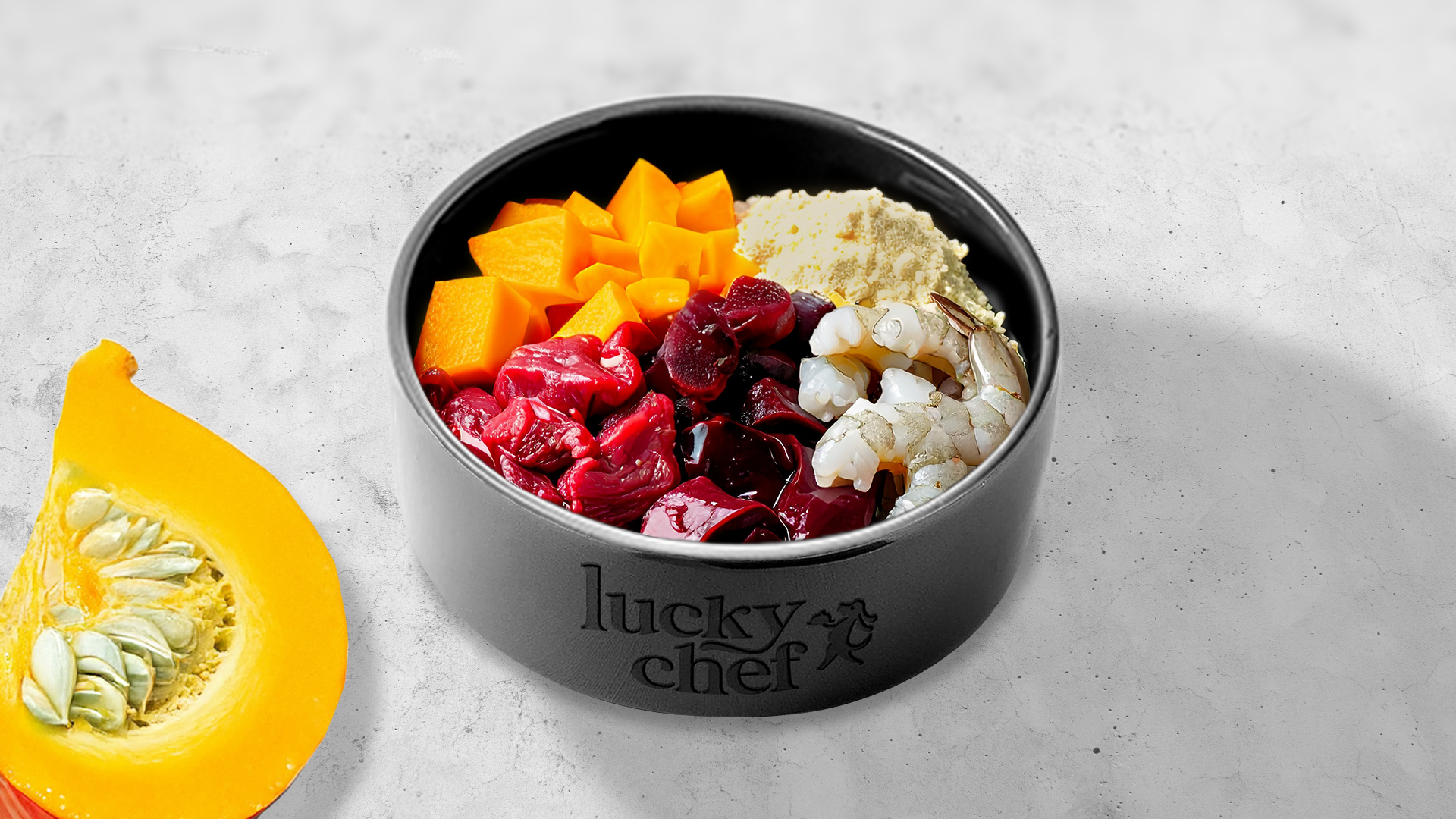 Das Kerngehäuse und die Samen aus dem Hokkaido-Kürbis entfernen. Hokkaido-Kürbis, Rindergulasch, Rinderleber und Shrimps in kleine Würfel schneiden