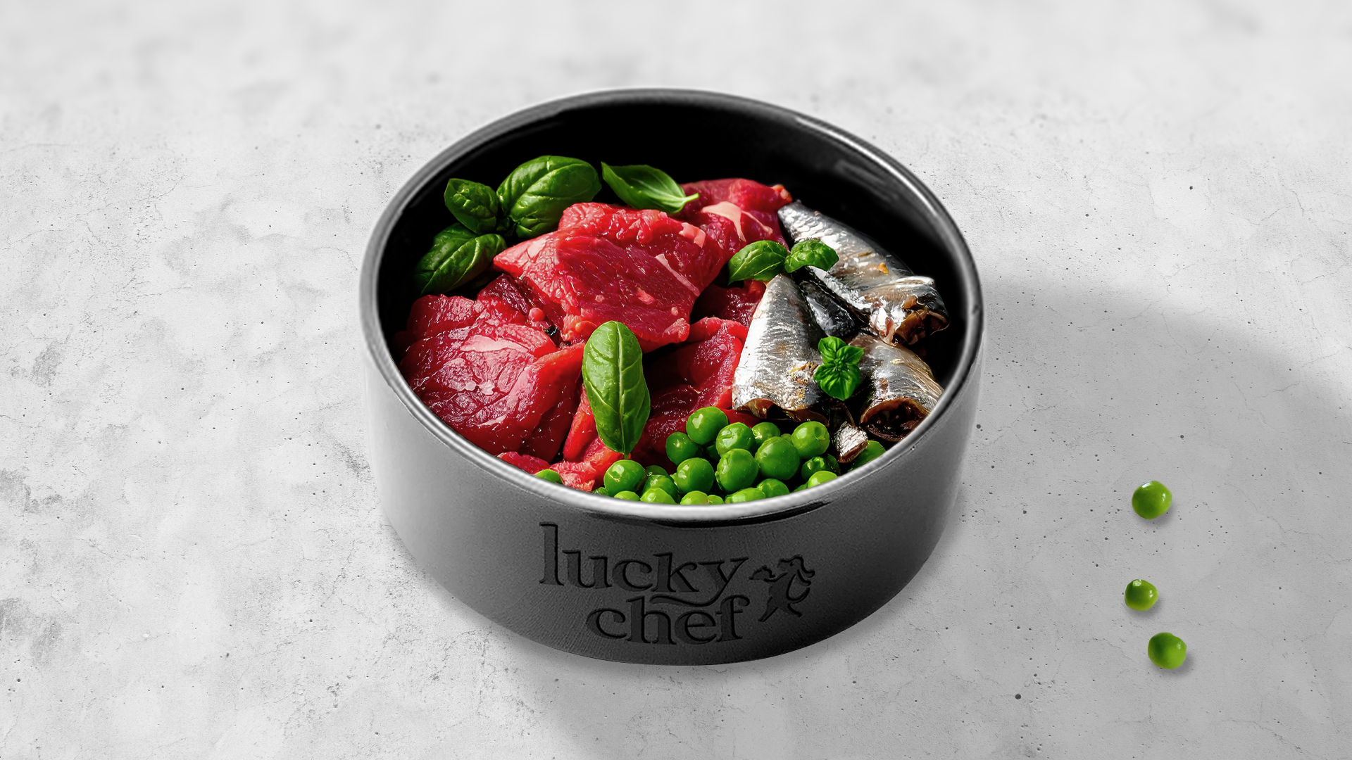 Adult Katzenmenü, wo Land auf Meer trifft: eine Kombination aus Rind mit Sardinen, Erbse und Basilikum