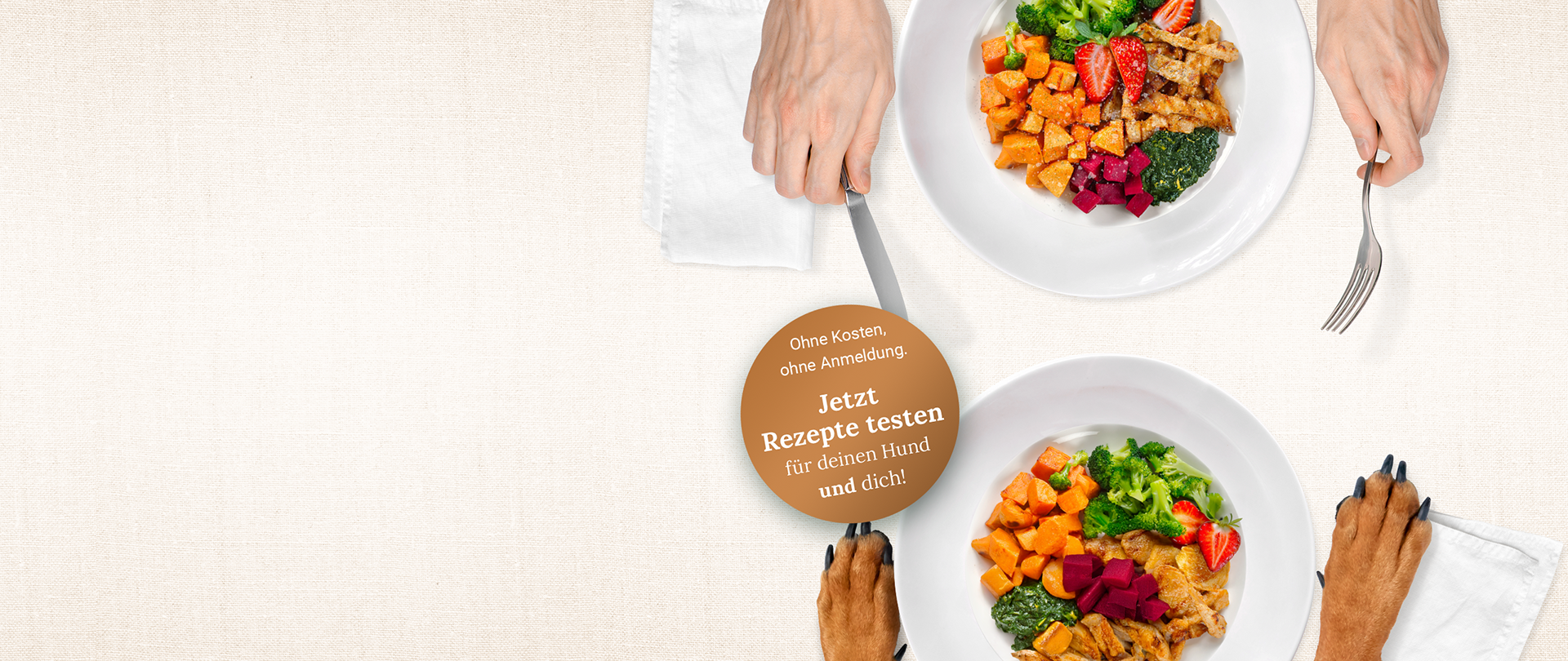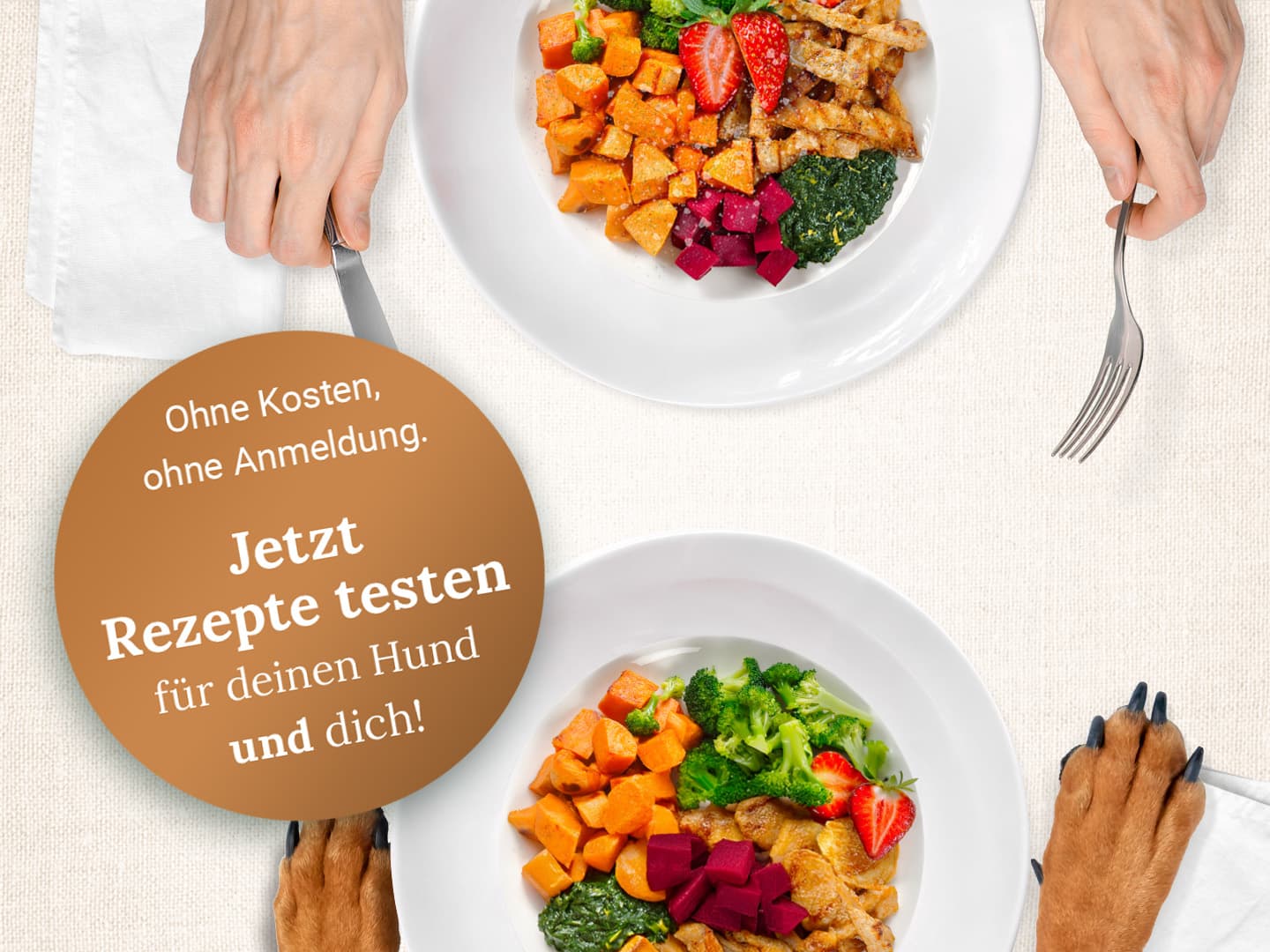 Wenn du frisches Hundefutter selber kochen willst, haben wir für euch drei kostenlose Rezepte zur Auswahl. Dazu erhältst du eine Übersicht aller Zutaten, Mengenangaben für euch beide sowie eine Schritt-für-Schritt-Kochanleitung mit einigen wenigen Unterschieden für deine Portion und die deines Hundes. Und das alles umsonst.